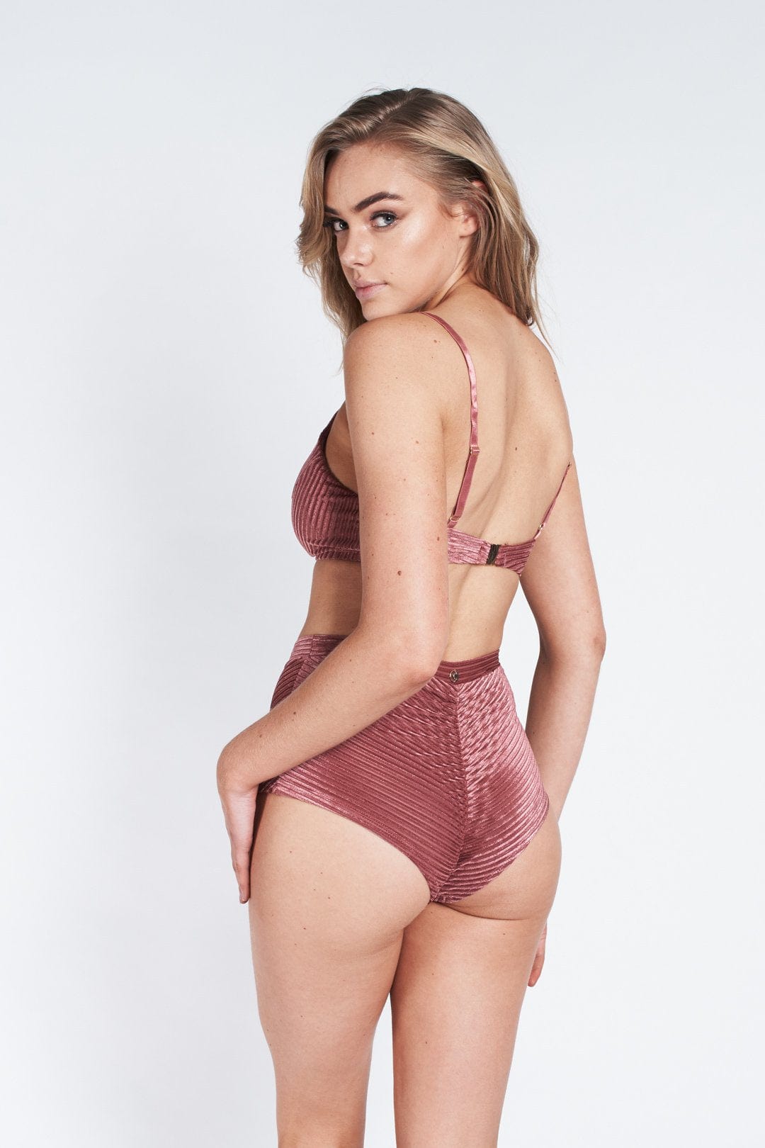 Lana top features a crushed velvet striped fabric that is oh so soft to the touch and comfortable for you to dance around as you please! Strategic fabric placement to enhance the natural shape and flatter all chests. Pair it with the Lana low or high waist bottoms for a complete set!